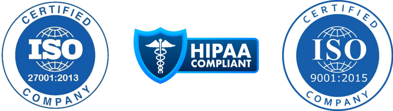 We, as a team, have worked tirelessly to get certified as an ISO 9001:2015, ISO 27001:2022, and HIPAA-compliant company. These certifications validate our adherence to rigorous standards and industry best practices and reflect on our dedication to delivering exceptional services in keeping with rules and government mandates.